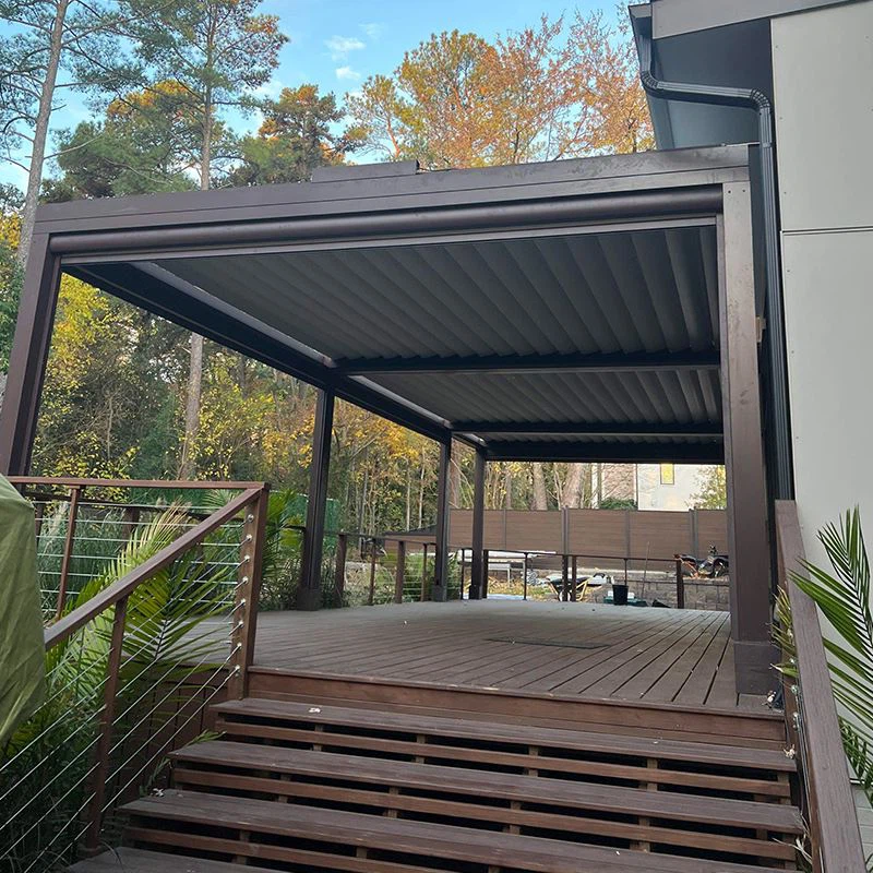 Tá an gazebo déanta as louvres alúmanaim agus is féidir é a úsáid i dtimpeallachtaí éagsúla. Feabhsaíonn an sciath púdar spraeála taobh amuigh an cumas uiscedhíonach agus féadann sé áilleacht fadtéarmach a chothabháil. Níl eagla ar an gcóimhiotal alúmanaim ar mildew, meirge nó ocsaídiú aer. Cibé an bhfuil sé grianmhar nó báistí, is féidir leis fachtóirí seachtracha a sheasamh agus a struchtúr a chobhsú. Ciallaíonn an dearadh le friotaíocht gaoithe suas le 180 km/u nach gá duit a bheith buartha faoi ghaotha láidre.