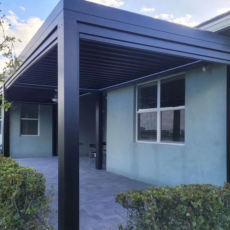 Tá fráma agus uasteorainn an gazebo déanta as alúmanam. Tá na colúin agus an uasteorainn leabaithe i ngach ceann eile. Tá an struchtúr cobhsaí agus is féidir leis a chruas brú trom nó gaotha láidre a sheasamh. Is féidir dearadh cróluas an uasteorainn a oscailt go dtí aon uillinn 90 céim. Tá grooves forluiteacha ag gach painéal ar an imeall chun uisce báistí a chosc ó dhul isteach agus cabhraíonn sé freisin le ró-thaise a scaoileadh. Is féidir rothlú na dallóga a rialú go huathoibríoch nó de láimh, cibé acu a roghnaíonn tú, leagann sé béim ar bhraitheann nua-aimseartha agus faiseanta. Is féidir leat an méid solais atá ag dul isteach agus ag aeráil sa phailliún a rialú faoi shaoirse, agus tá an ghrian agus na scáthanna i rith an lae faoi do smacht. Is féidir leat bask sa ghrian, tae a ól, nó éisteacht le fuaim na braonta báistí, a léamh leabhar maith, agus go ciúin taitneamh a bhaint as an radharcra álainn lasmuigh.