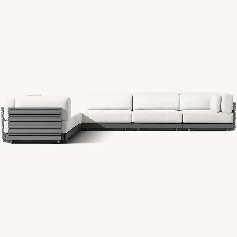 Tá ár patio L couch lasmuigh déanta as alúmanam ardchaighdeáin, rud a chinntíonn marthanacht agus friotaíocht na n-eilimintí. Aithnítear é mar gheall ar a n-airíonna éadroma ach láidre, tá alúmanam oiriúnach do throscán lasmuigh mar ní meirgeann sé, ní chreimeann sé ná míníonn sé. Déanann sé seo an tolg oiriúnach le haghaidh taitneamh ar feadh na bliana, beag beann ar an aimsir. Tá an fráma alúmanaim brataithe le púdar freisin le haghaidh cosanta breise agus bailchríoch caol, ag cur le aeistéitiúil iomlán do shocrú patio.
