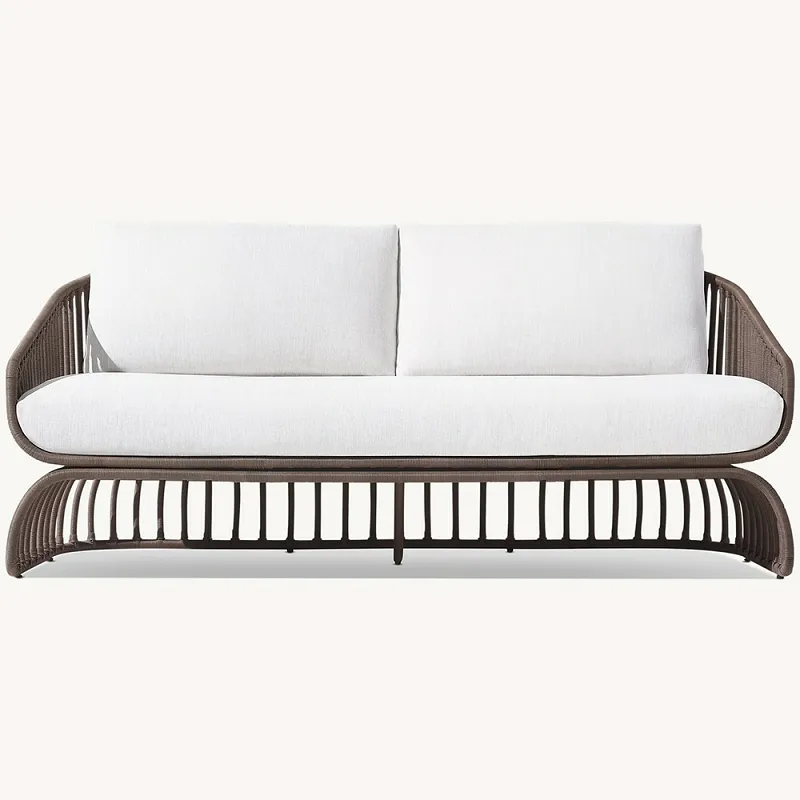 Buaileann Compord le galántacht lenár gcuasáin uile-aimsire plush, leathchiorcail. Tá siad seo deartha chun an chompord uasta a sholáthar agus a gcruth agus a mbeogacht a choinneáil, is cuma an aimsir. Spreagann dearadh leathchiorcail an tolg comhrá agus déanann sé pointe fócasach foirfe do chruinnithe sóisialta, ag tairiscint suíocháin cuimsithí i bhformáid stylish. Cibé an bhfuil tú ag óstáil cóisir nó ag taitneamh a bhaint as tráthnóna síochánta lasmuigh, soláthraíonn an tolg seo an meascán foirfe de chompord agus sofaisticiúlacht.